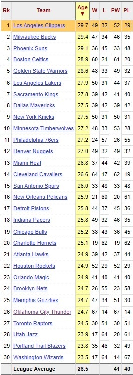 熊猫直播4月13日讯 本赛季,奇才阵容的平均年龄为23.5岁,是NBA30支球队中最年轻的球队,快船则以29.7岁的平均年龄,成为联盟中的最老球队,详情如下: 1、奇才:23.5岁 2、开拓者:23.8岁 3、爵士:23.9岁 4、猛龙:24.5岁 5、雷霆:24.7岁 6、灰熊:24.7岁 7、篮网:24.7岁 8、魔术:24.9岁 9、火箭:24.9岁 10、老鹰:24.9岁 11、黄蜂:25.1岁 12、公牛:25.2岁 13、步行者:25.8岁 14、活塞:25.8岁 15、鹈鹕:25.9岁 16、马刺:26岁 17、骑士:26.6岁 18、热火:26.8岁 19、掘金:27岁 20、76人:27.2岁 21、森林狼:27.2岁 22、尼克斯:27.5岁 23、独行侠:27.5岁 24、国王:27.8岁 25、湖人:27.9岁 26、勇士:28.6岁 27、凯尔特人:28.9岁 28、太阳:29.1岁 29、雄鹿:29.4岁 30、快船:29.7岁