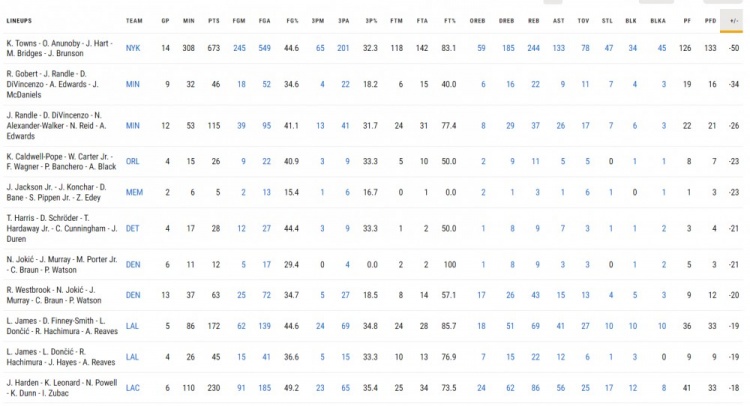 熊猫直播5月24日讯 尼克斯今天在主场109比114再负步行者,系列赛大比分0比2落后。 季后赛至今,尼克斯的首发阵容正负值为-50,这一数据在联盟所有的5人组里、排名倒数第一。 两场东部决赛,尼克斯的首发阵容正负值为-29,而这两场比赛尼克斯一共只输了8分。