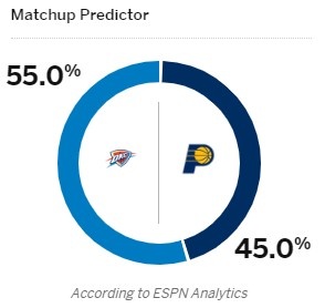 熊猫直播6月9日讯 NBA总决赛G2,雷霆在主场以123-107击退步行者,将大比分追至1-1。 ESPN随后更新了系列赛G3的获胜概率:雷霆55%,步行者45%。 双方的G3将在6月12日上午8:30进行,步行者主场。