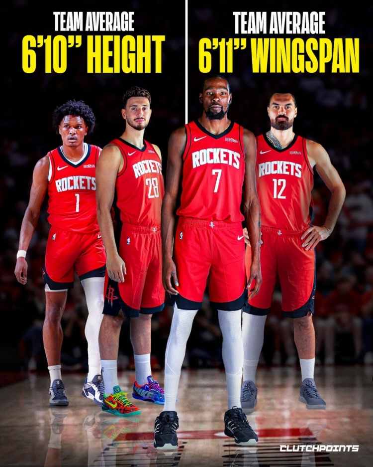 熊猫直播10月13日讯 Clutch Points报道,根据官方数据信息,火箭全队平均身高达2米08(6尺10),全队平均臂长2米11(6尺11.2),相比联盟平均的平均臂展2米08(6尺10)还要更长。 除了身高、臂展,火箭全队平均体重约109公斤(241磅),同样让他们比他们将面对的大多数对手都更重、更硬。