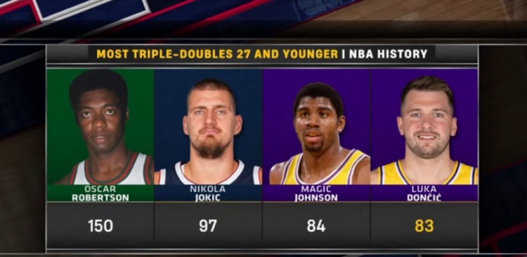熊猫直播11月3日讯 湖人主场130-120击退热火,取得3连胜,东契奇本场比赛砍下29分11板10助,生涯第83次三双。 据统计,东契奇未超27岁(目前26岁254天)已经83次砍下三双,NBA历史第4,仅次于奥斯卡-罗伯特森(150次)、约基奇(97次)、魔术师(84次)。