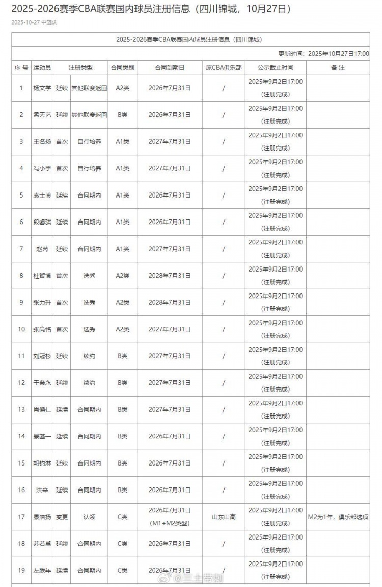 熊猫直播11月20日讯 媒体人@三土带刺发文谈到了四川男篮的情况。 原文如下: 客观来说,四川队目前这个阵容,难称“超市”,可选的并不多。 窗口期只能认领和互换,所以需要球队和球员解除合同才能操作。球队若退出联赛,需要审批之后,要提前30天通知球员解除合同,这也需要审批时间。 而球队拖欠工资,球员书面催促30日后,可以有权解除合同,这同样需要审核时间。 所以第一个窗口期11月16-22日,肯定来不及了。第二个窗口期为常规赛第15轮最后一个比赛日(含当日)前7天(1月15日),所以时间为2026年1月9-15日。第三个窗口期为常规赛倒数第十轮第一个比赛日(不含当日)前七天,也就是第32轮第一个比赛日(3月29日),所以时间为2026年3月22-28日。 这中间审核、认证等等,时间很难控制,所以球员还是很难的,这赛季有没有球打、何时能打上不好说。